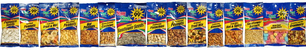 We use only the highest quality ingredients to create our complete line of premium nuts, dried fruits, and candies. As a family run business, we put our people first and take pride in creating a product that our customers can trust. Our commitment to quality extends far beyond our factory walls, which is why we offer full service direct store delivery to keep our products fresh and always available. Stone Creek makes snacking fun with over 100 varieties to choose from. Only the best, from our family to yours.